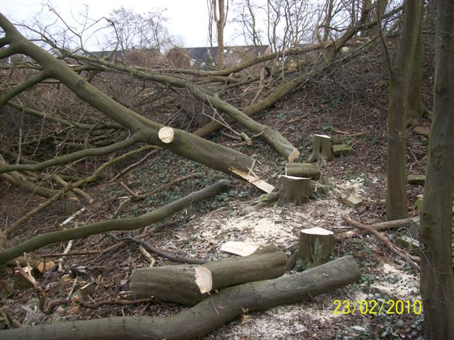 Dort wurden nun 70 Bäume auf dem Grundstück An der Mühle/Ecke Lülsdorfer Str gefällt, obwohl noch keine Baugenehmigung vorliegt. Etwa 30 Bäume sollen unter die Baumschutzsatzung fallen. Es gab etliche Baumgruppen, auch mehrstämmige Bäume.